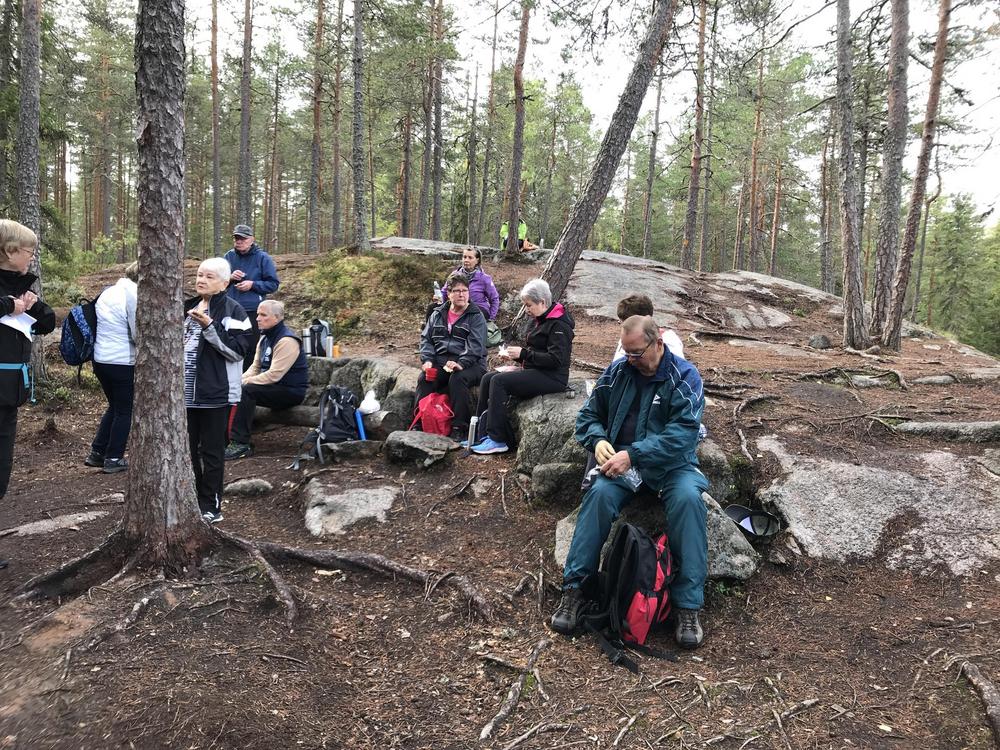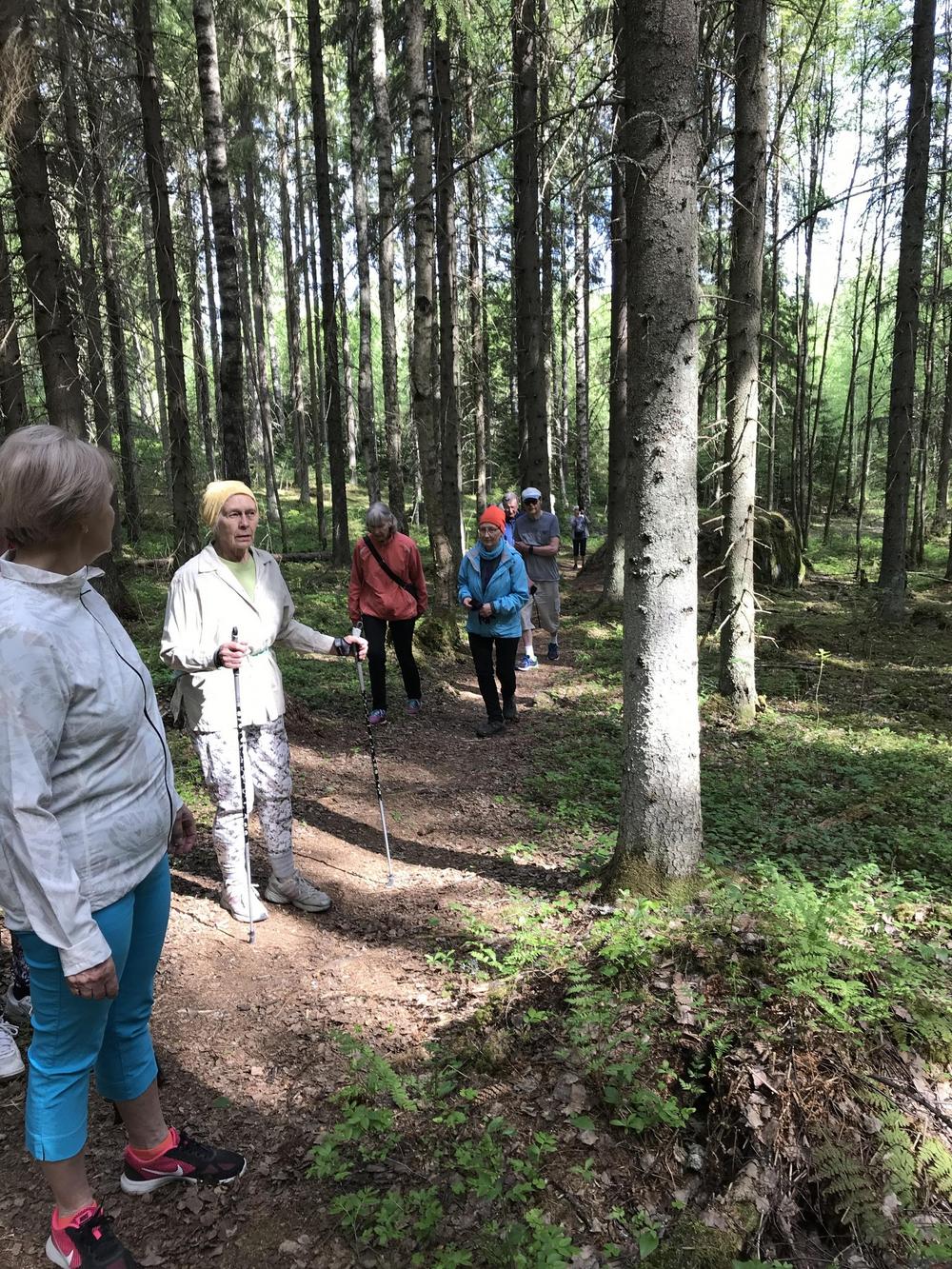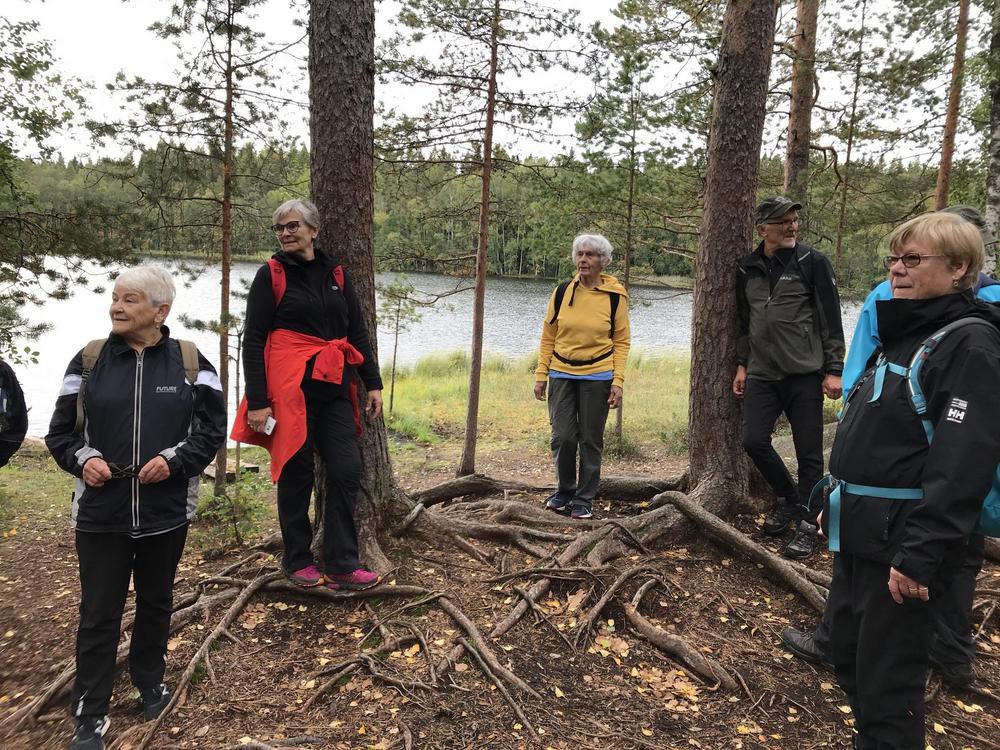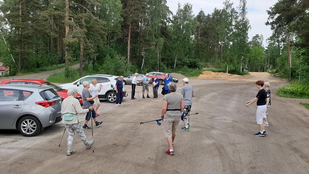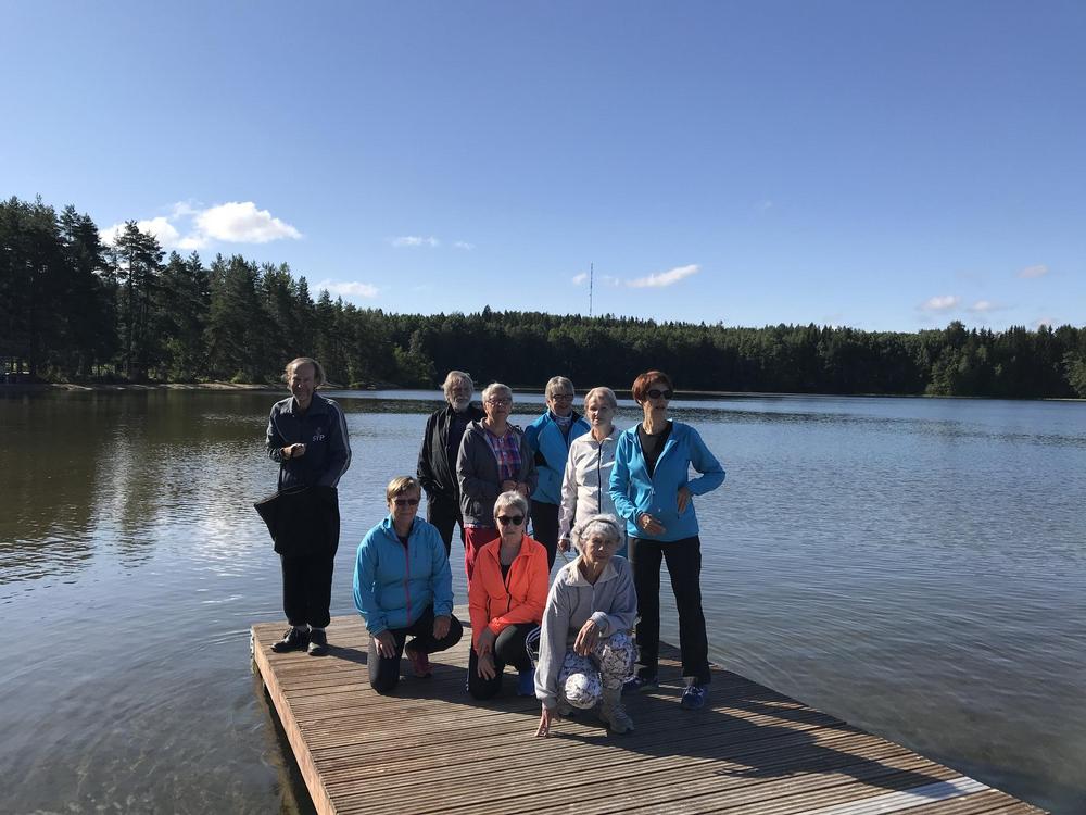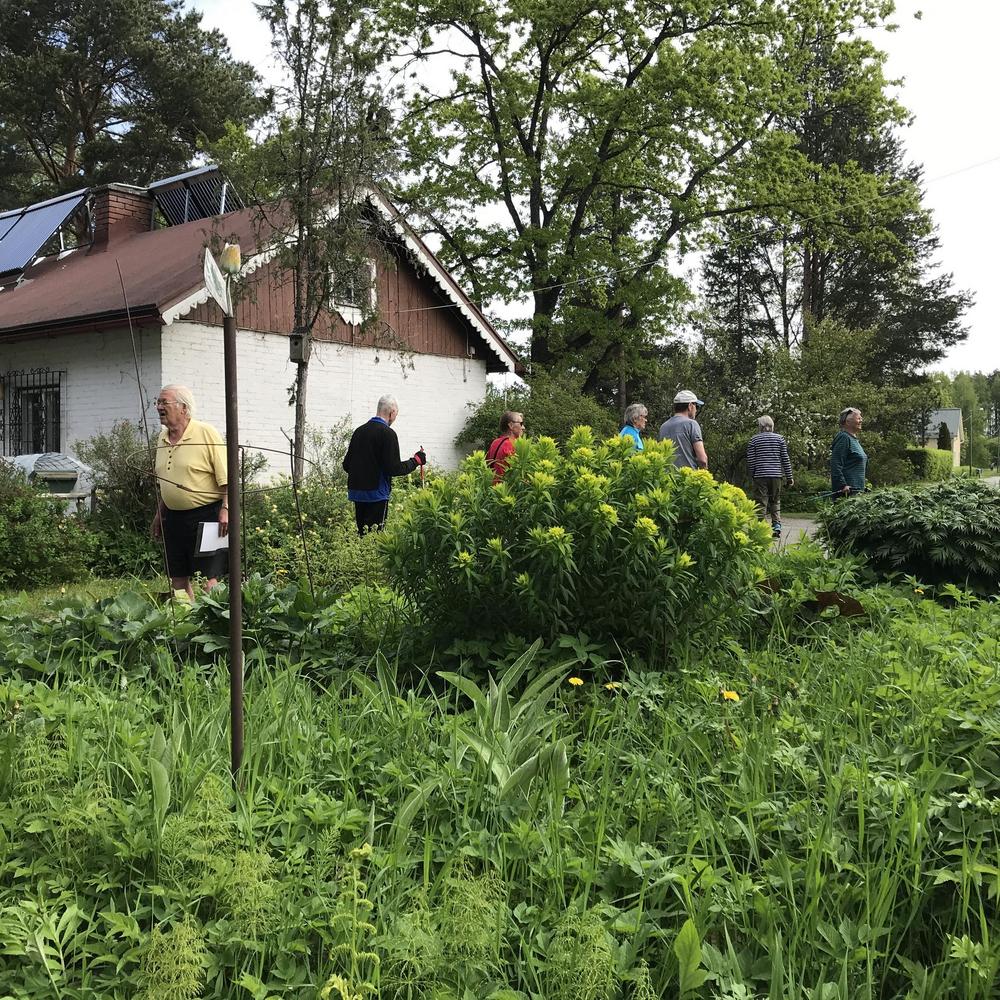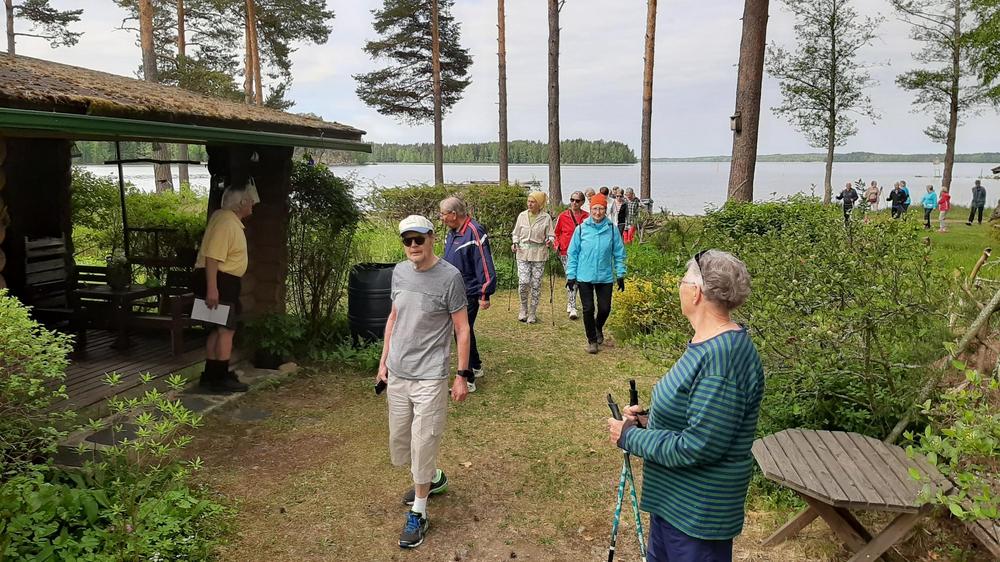 Ensimmäinen kävely koronatauon jälkeen. Kokoontuminen Pakanranta. Mukana kävelemässä 23 senioria. Kävely alkoi yllätyskierroksella Marja ja Kosti Majaran puutarhassa Pakanrannassa. Tästä matka jatkui rantareittiä puhdistamon rantaan ja siitä ylös metsäpoluille.