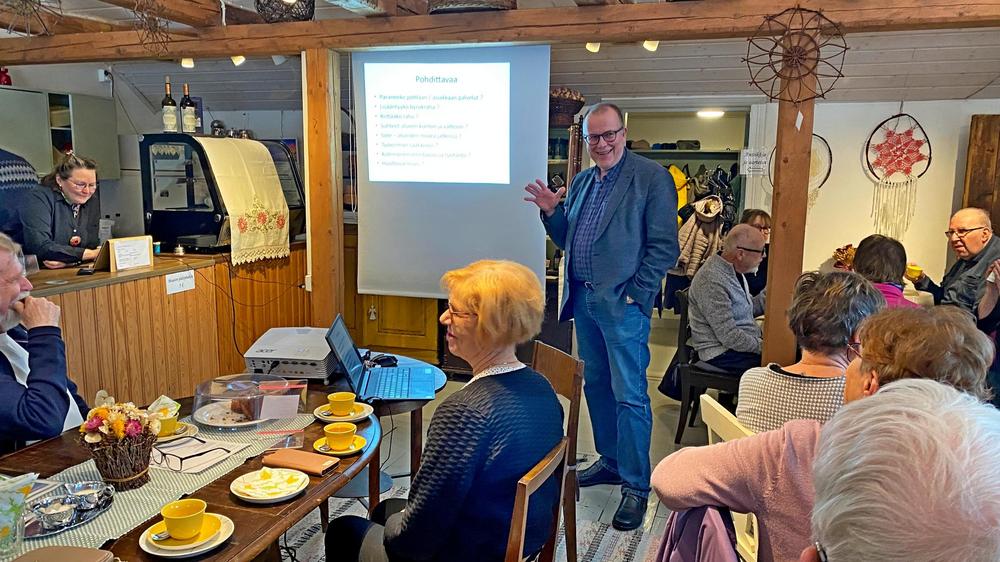 Lähes 40 senioria kokoontui kuukausitapaamiseen Viinikahvila Pajuparvelle, kun aluevaltuutettu, erikoislääkäri Mauri Jussila tuli kertomaan Pirhan liikkuvista palveluista sekä digi- ja etäpalveluista. Voitte uskoa, että maittavien iltapäiväkahvien äärellä meitä kaikkia koskevien aiheiden äärellä virisi kerrassaan kiinnostava keskustelu. Kuvat nappasi Rannan Riitta.