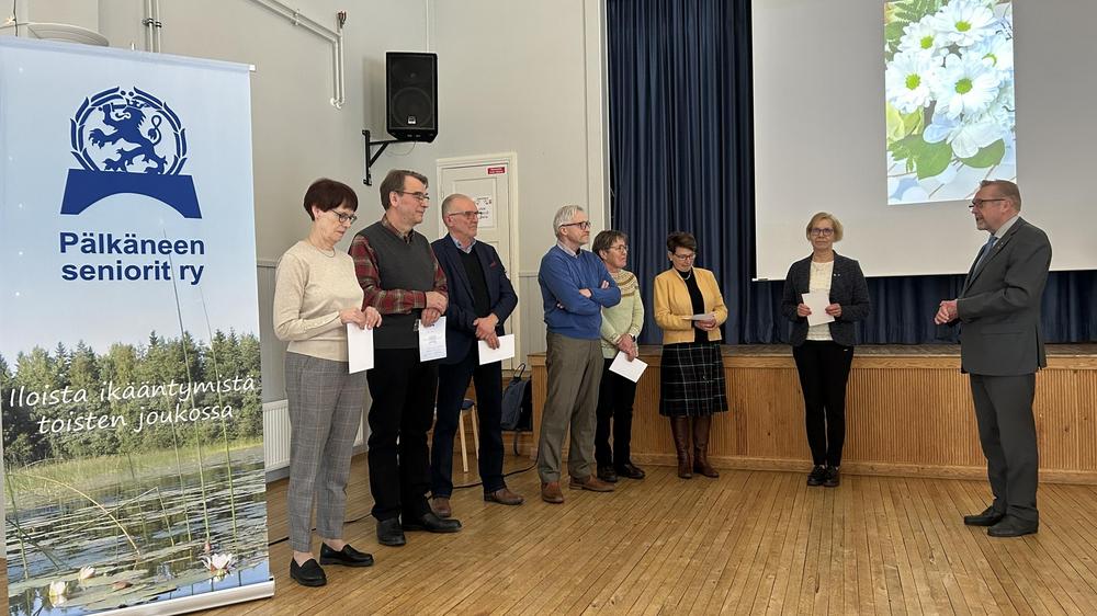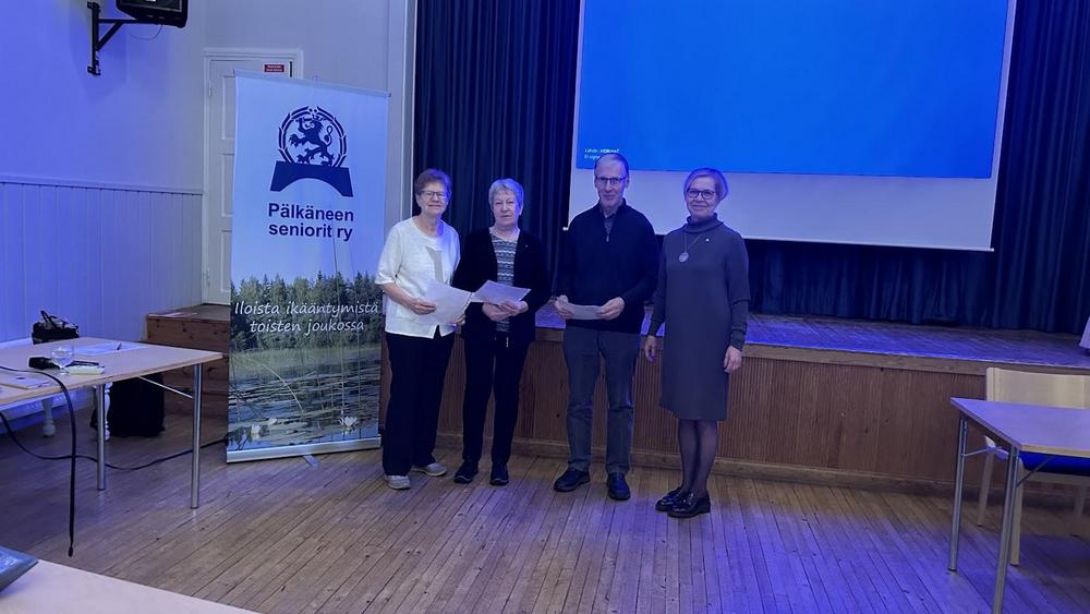 Prossiset ansiomerkit saivat Riitta Helenius (vasemmalla), Lea Ahola ja Heikki Heikkilä. Ansiomerkit luovutti puheenjohtaja Tiina Kokkola (oikealla).